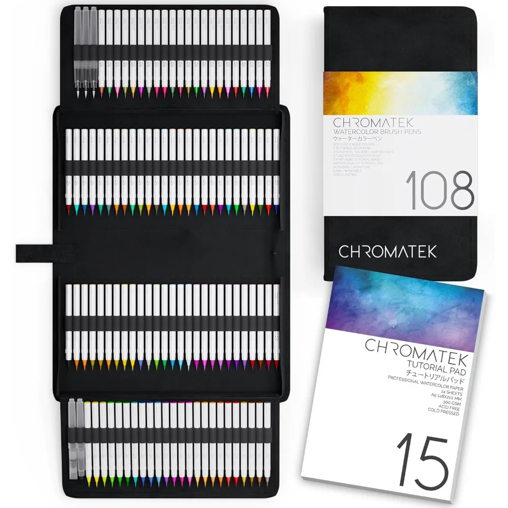 108 Watercolor Pens Set | Including 15 Page Pad & Online Video Tutorial Series | 5 Aquapens & 100 Unique Colors