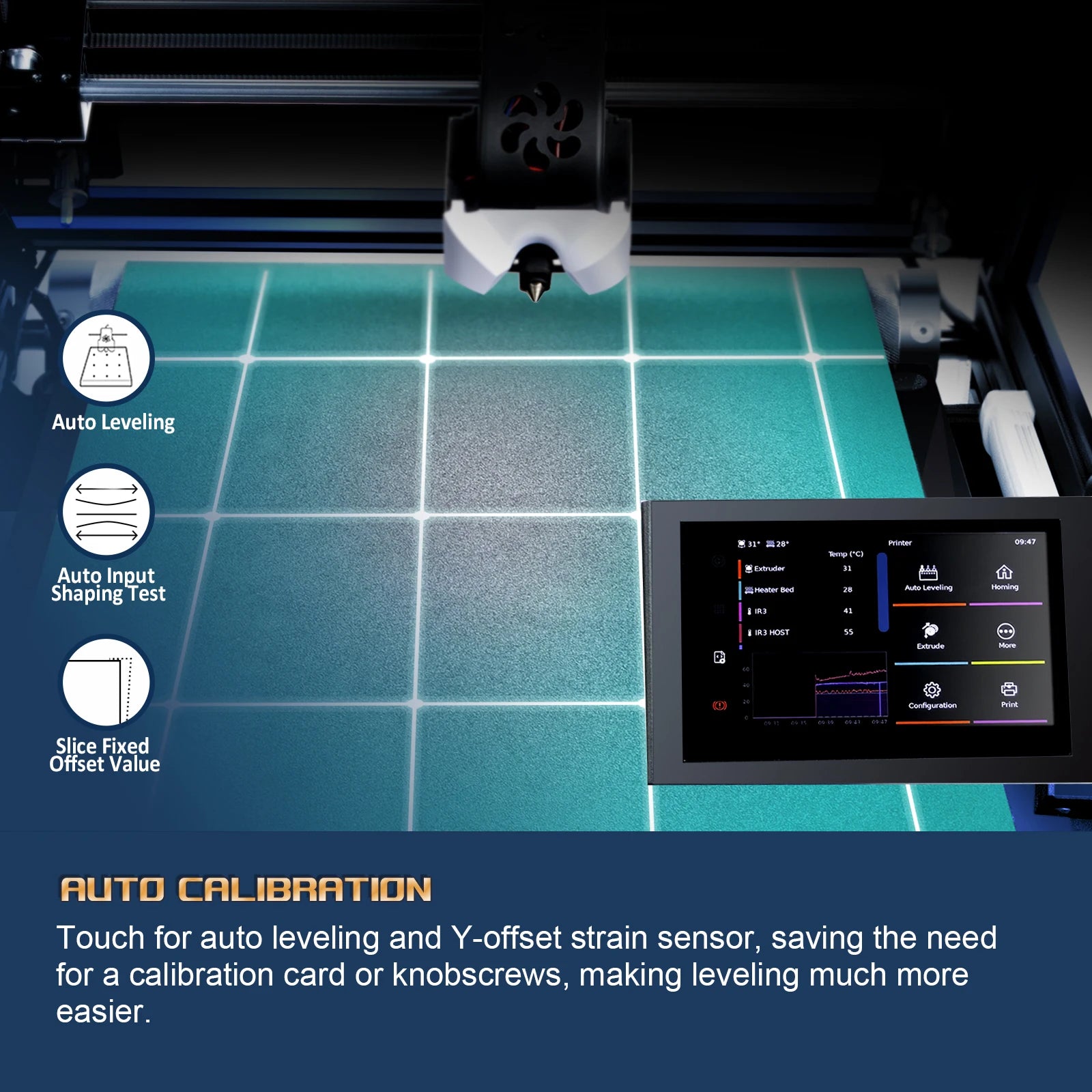 1.100% auto leveling by machine after assembled. Print head with senser , it will detect the distance with the bed platfrom , and matched with the slice setting Y offset -0.1 to -0.2mm , then it will sticker well on the belt .