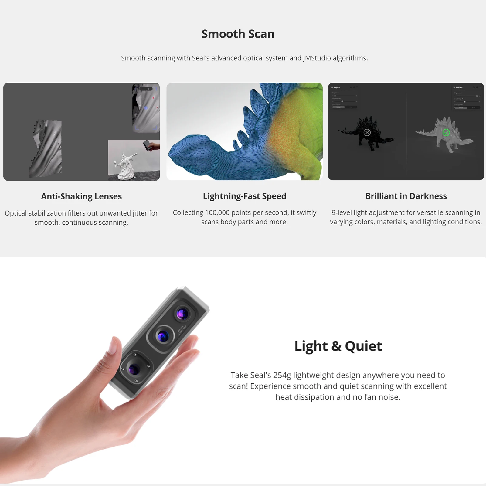 [Seamless Scanning Experience] The SEAL 3d model scanner series incorporates professional-grade optical lenses, enhancing visual performance to an exceptional level. By utilizing single-frame encoded structured light technology, each photo can generate a point cloud frame, enabling a true 10fps scanning speed and ensuring a smooth scanning experience.