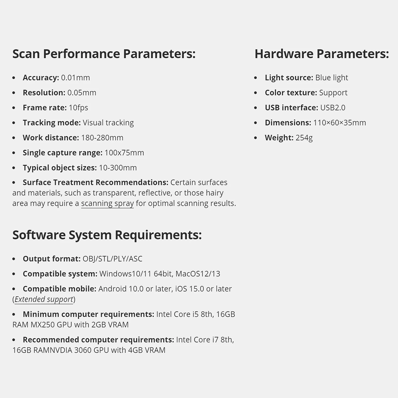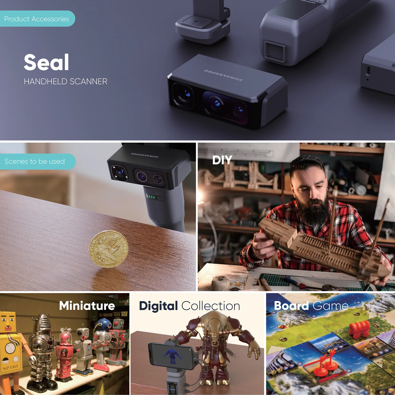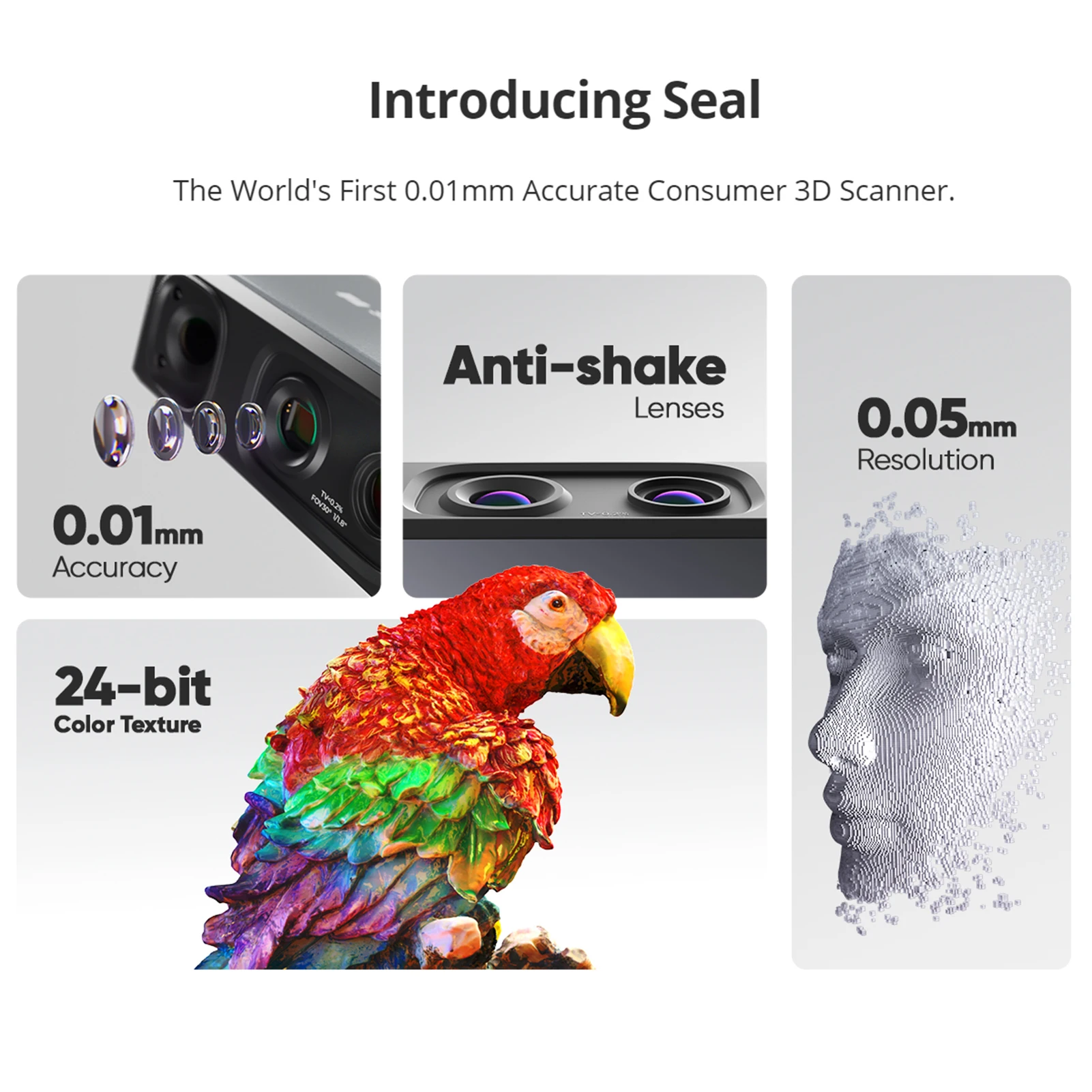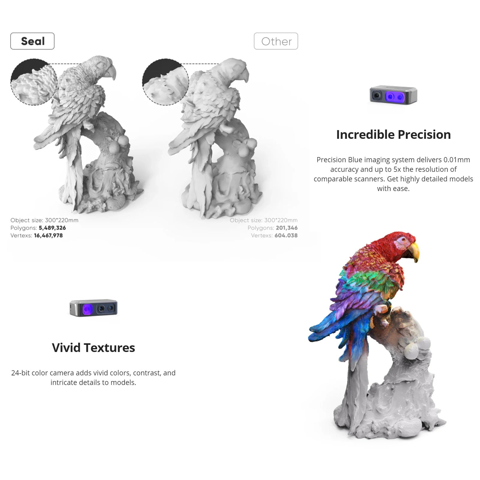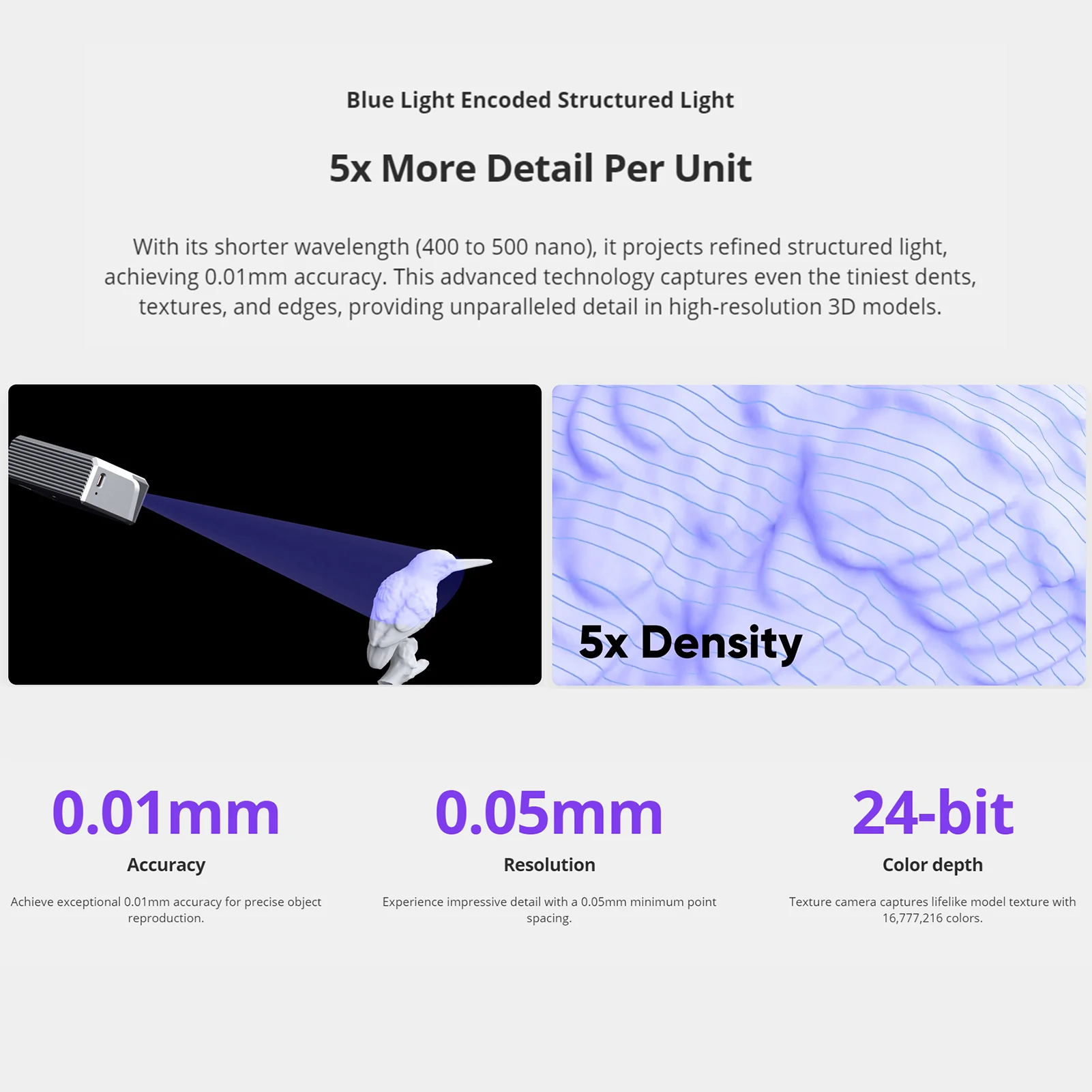 [Accurate and Detailed Scanning] The Seal 3d scanner offers remarkable precision with a 0.01mm accuracy and a resolution of up to 0.05mm. It utilizes advanced Blue Light Encoded Structured Light technology to capture the smallest imperfections, textures, and edges, resulting in highly detailed and precise 3D models.