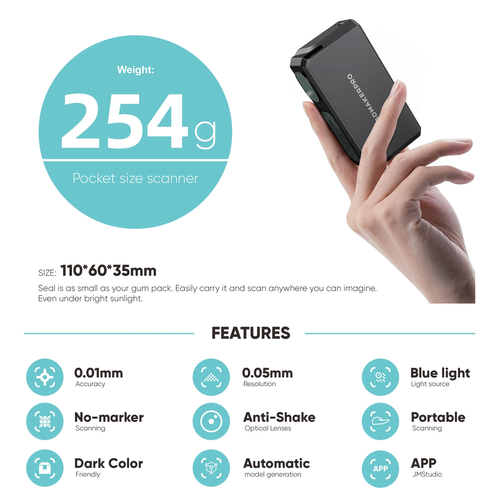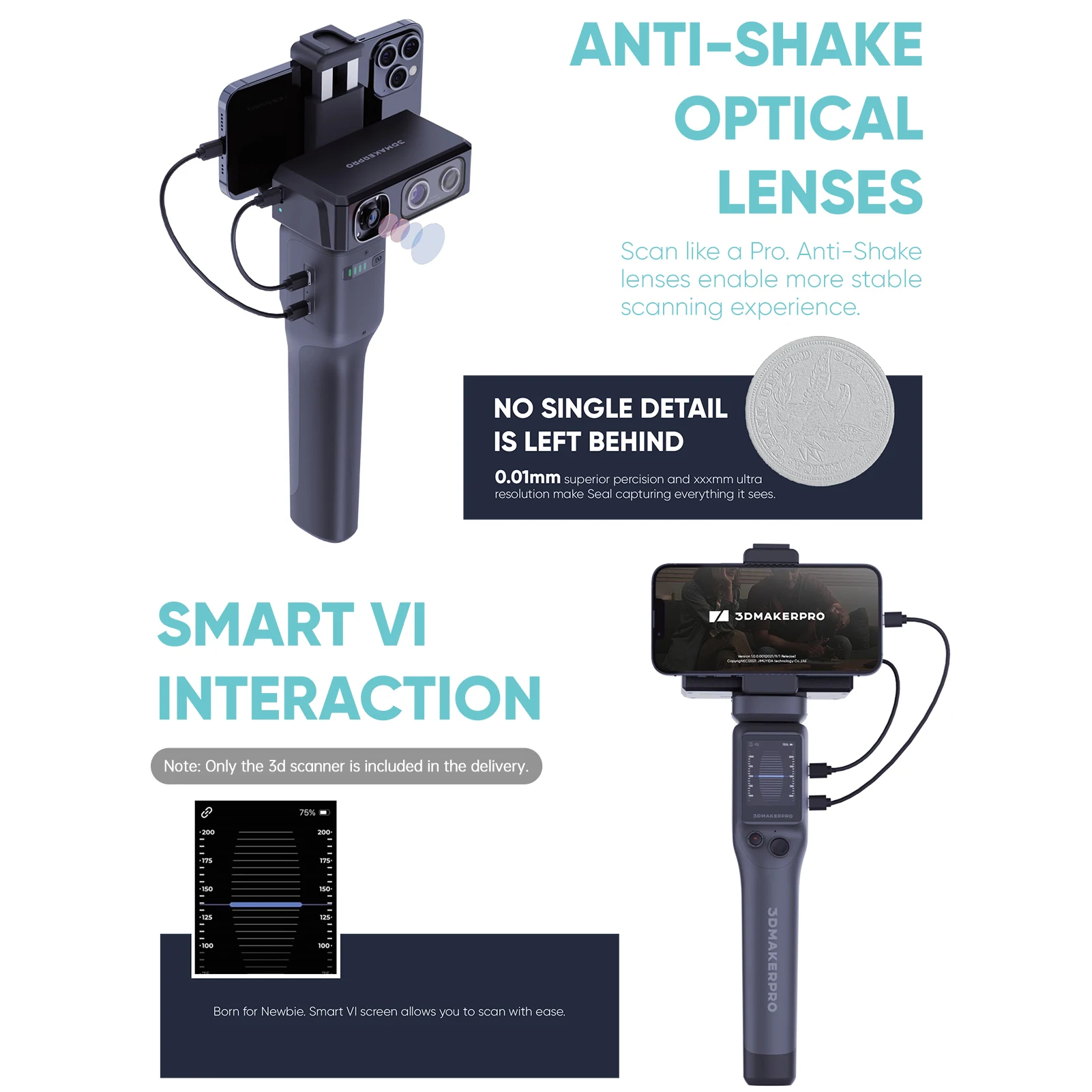 3DMakerpro Seal 3D Scanner for 3D Printer with 0.01mm Accuracy 24-bit Color Camera 10FPS Scanning Speed Anti-Shake Scan Scanner