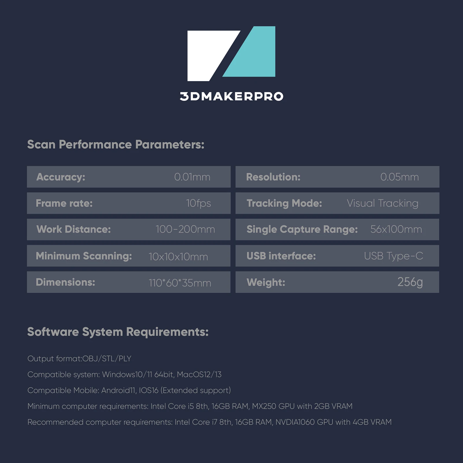[Flexible Scanning Scenarios] The handheld 3d scanner, paired with the official JMStudio software, supports OBJ/STL/PLY/ASC formats, empowering you to edit, refine, render, or print your scans using your preferred design software. This versatility caters to various 3D model needs in fields such as modeling, animation, presentation, printing, and design, expanding the applications of your scans. The 3DMakerpro Seal 3d scanner is compatible with Windows10/11 64bit and MacOS12/13 operating systems.