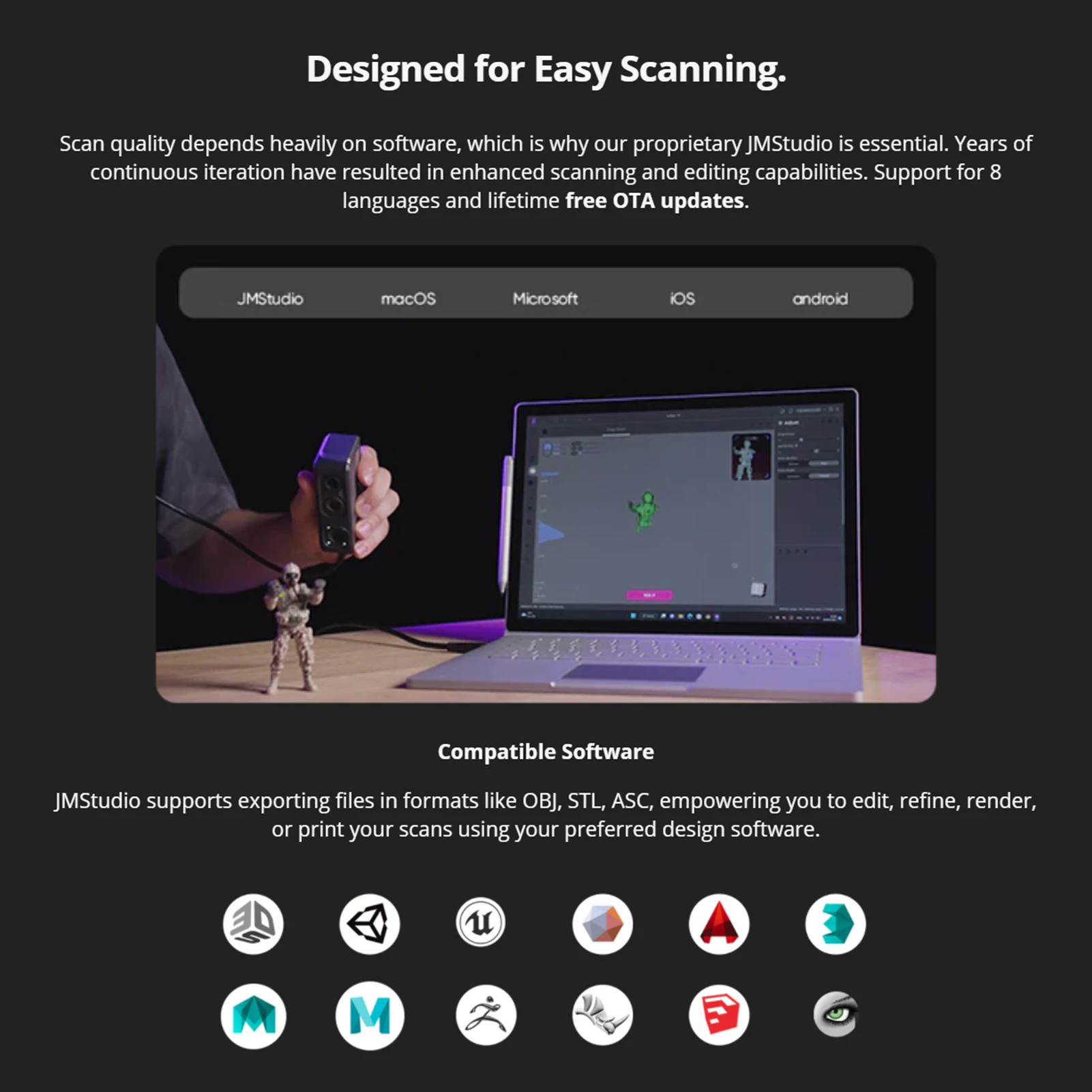 [Advanced Software Capabilities] The quality of your 3D scans heavily relies on software, and the 3DMakerpro Seal 3d scanner comes with our self-developed JMStudio software, which is essential for achieving high-quality results. JMStudio supports 8 languages and provides lifelong free OTA updates. It integrates scanning, editing, and fusion functions, eliminating the need for third-party software and enabling you to create high-quality models effortlessly.