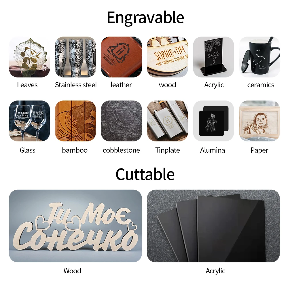 Support engraving: Wood, Bamboo, Paper, Plastic, Leather, PCB board, Aluminium Oxide, Non-Reflective Coating and Lacquered Metal,Ceramic
