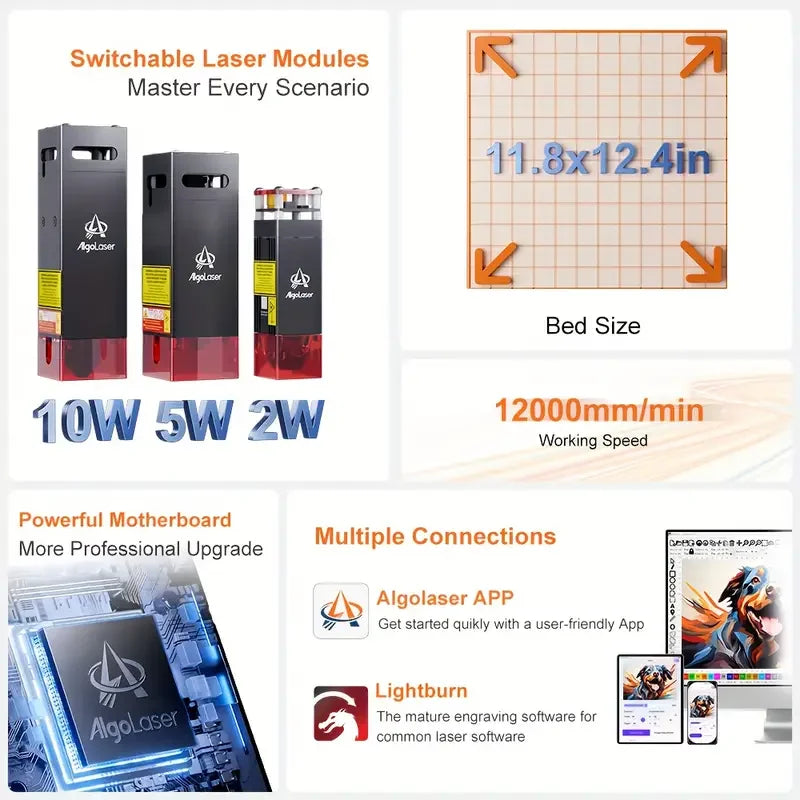 Control Softwares:LaserGRBL (free), LightBurn (Paid Software), APP wire WI-FI