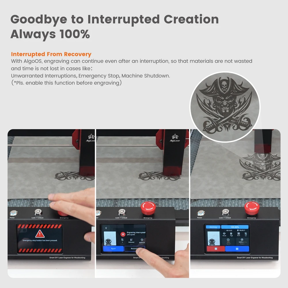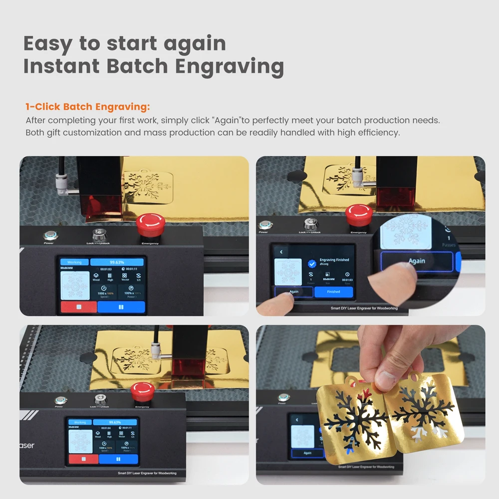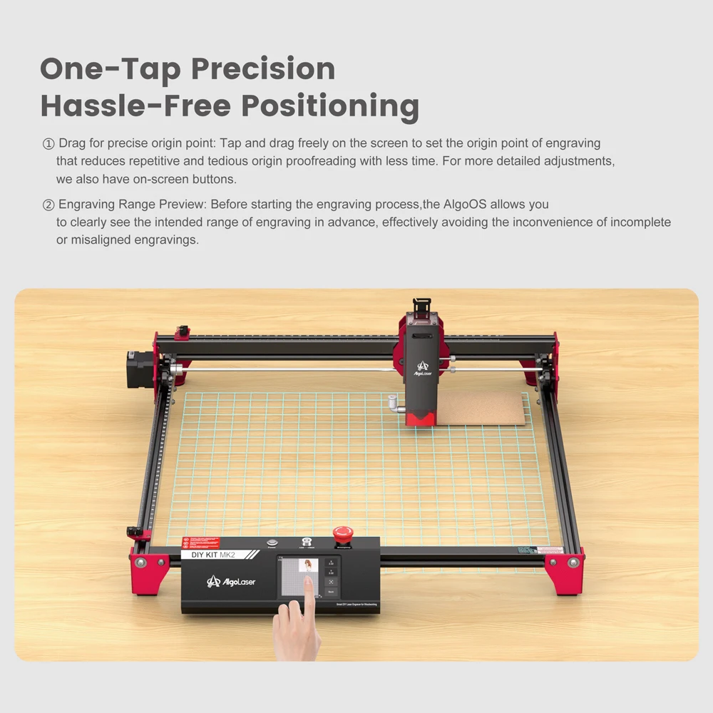 【Super Easy to Use】AlgoLaser DIY KIT MK2 10W Laser Engraver has a built-in interactive 3.5" color LCD touch screen with a user-friendly interface. ①A clear user interface boasts a larger screen that makes it easy to read, comprehend, and operate.②Enjoy instant reactions without lag on every tap, ensuring a smooth interaction experience.③Simple connectivity ensures hassle-free wifi access, enhancing your online experience.It's super easy engraving just like using phone.