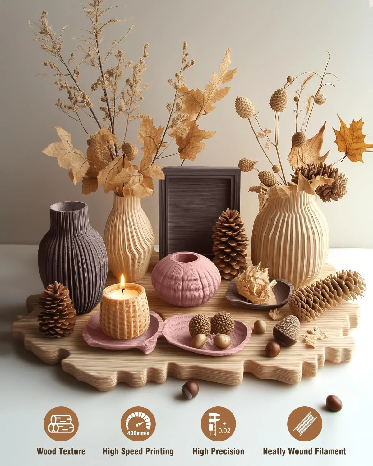 PLA with 15% wood powder, the prints have the texture and flavor of wood.